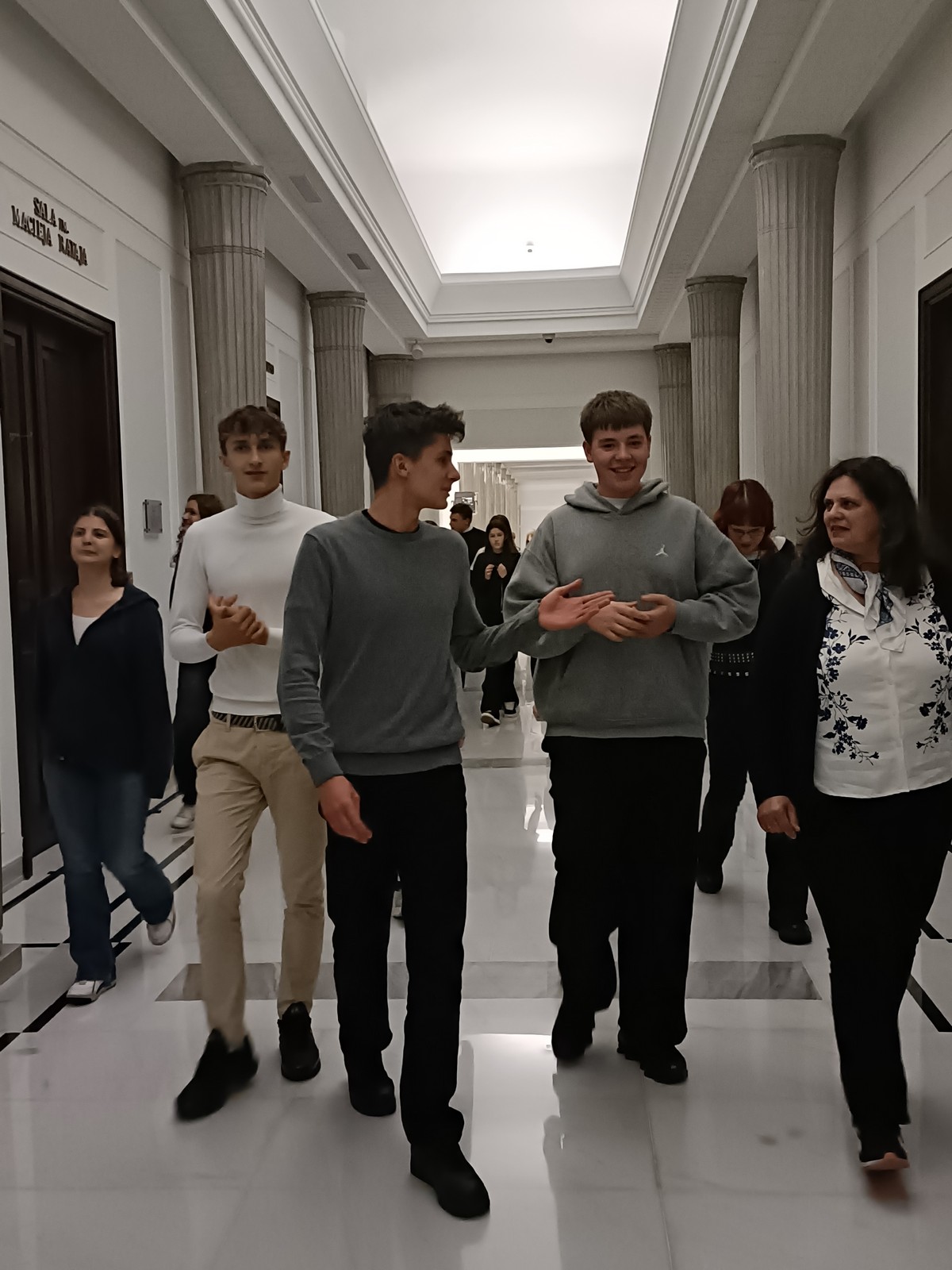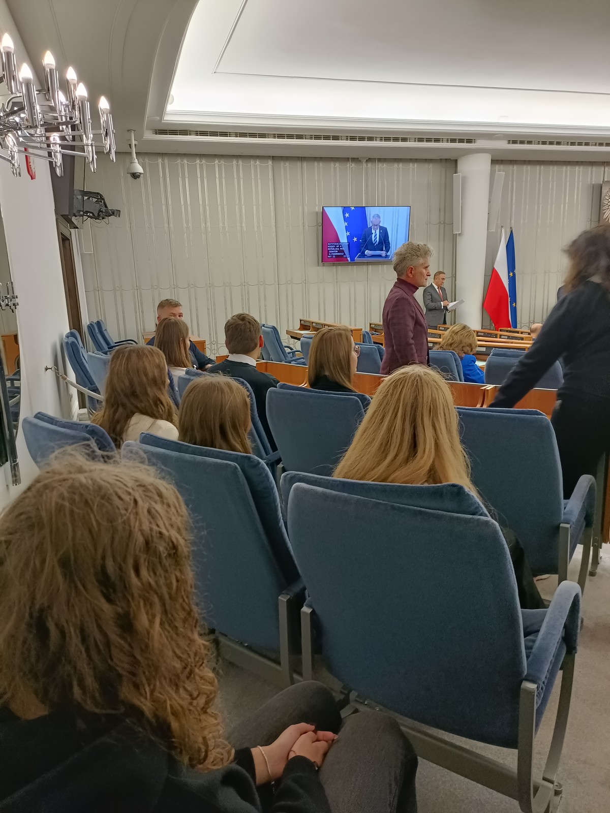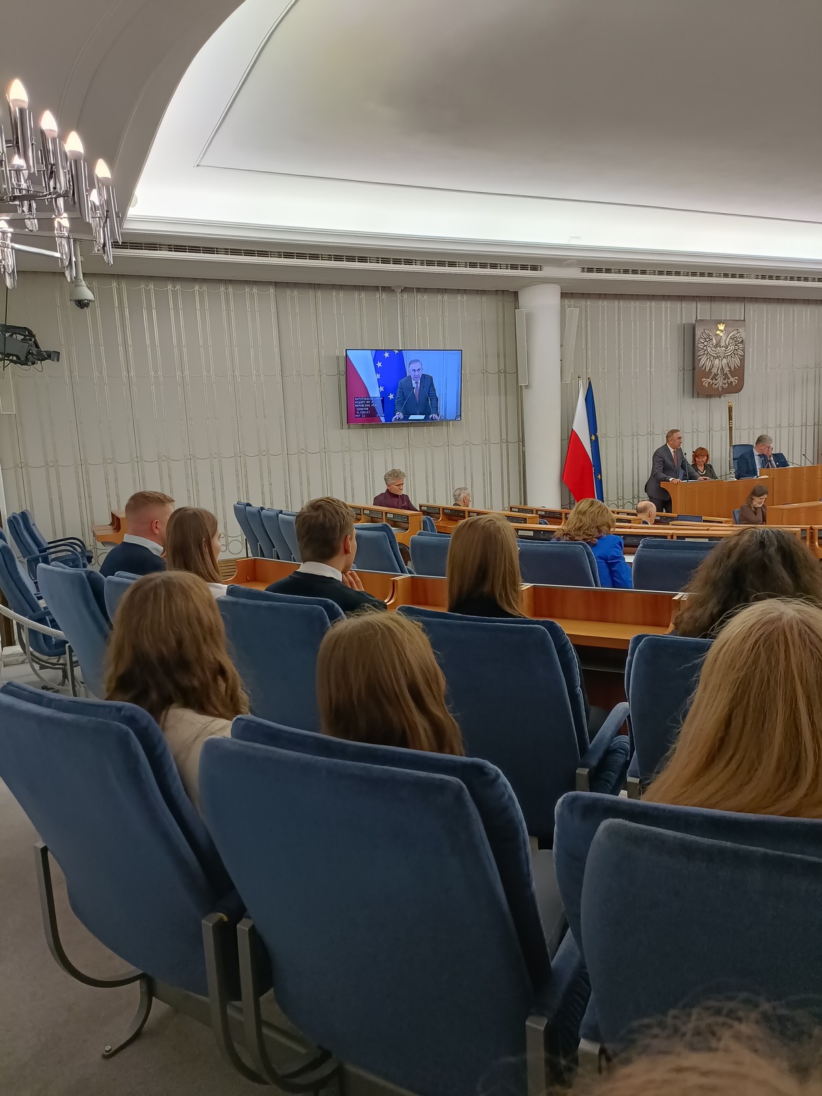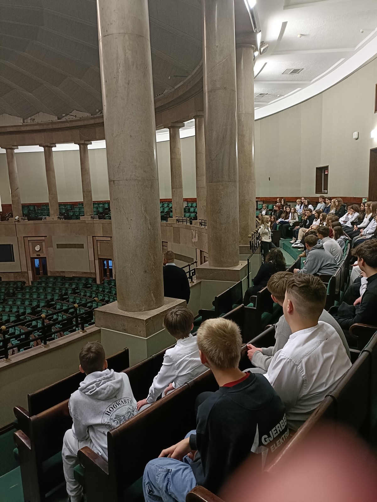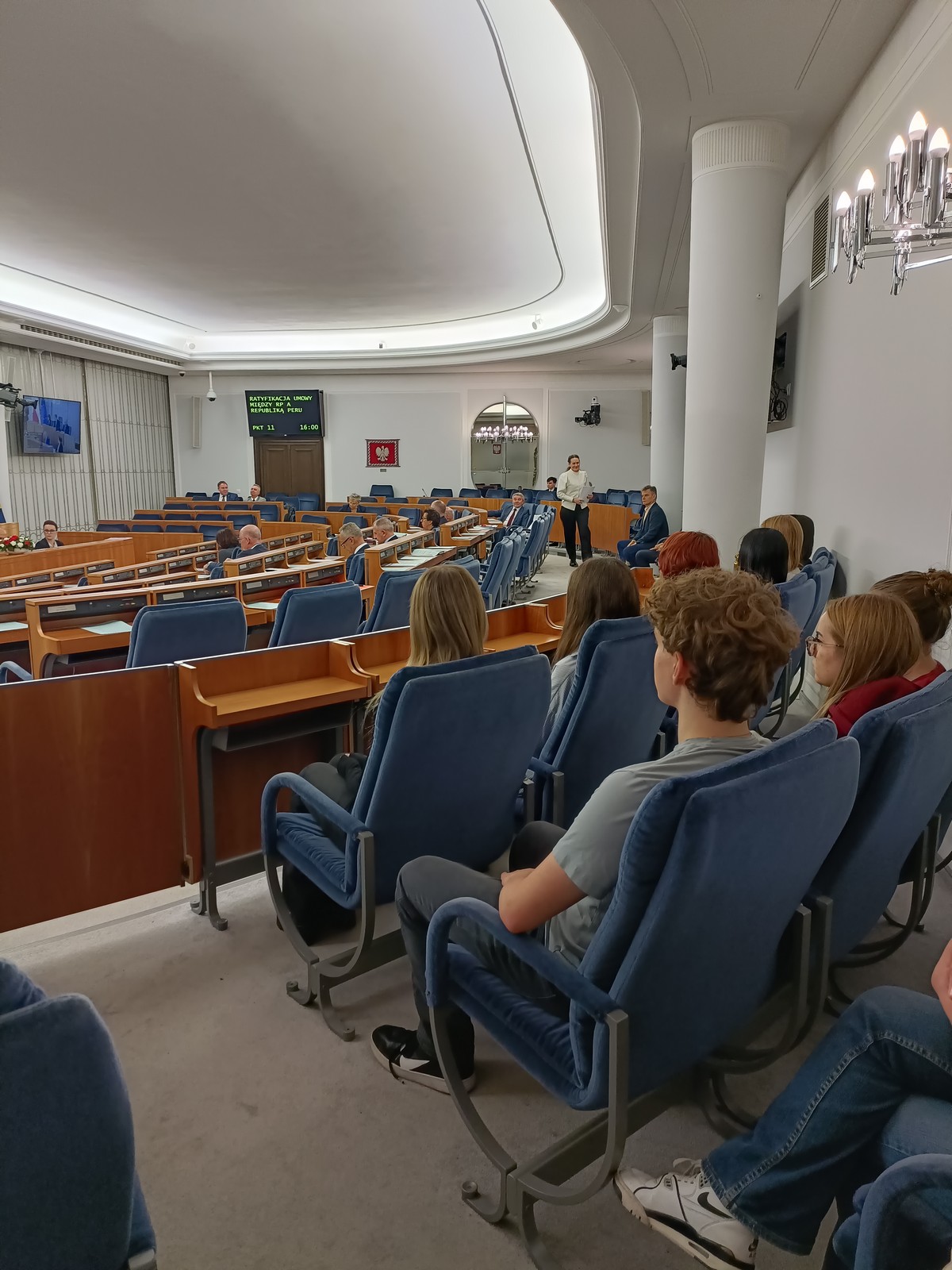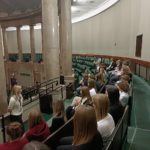 Druga część wycieczki obejmowała przestrzeń Parlamentu i tu już same liczne i skrupulatne kontrole wywołały spore emocje. Domowy obiad w starym Domu Poselskim w towarzystwie pana senatora był dla młodych ludzi okazją do „zwykłej” rozmowy ze znanym i szanowanym parlamentarzystą. I w końcu spacer po parlamencie, w którym nie tylko weszliśmy do sali posiedzeń Sejmu, którą znaliśmy z telewizyjnych wiadomości, ale także w sali senackiej wzięliśmy udział we fragmencie posiedzenia, na którym nie tylko wysłuchaliśmy części dyskusji nad ustawą o umowie ekstradycyjnej z Peru, ale zostaliśmy przez wicemarszałka Senatu powitani jako wolontariusze „Pól Nadziei”. To był duży zaszczyt, a wizyta w Parlamencie zostawiła w nas niezapomniane wrażenia.